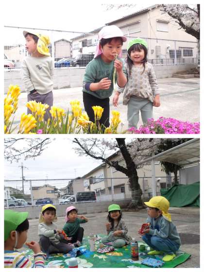 たんぽぽの綿毛を見つけると子どもたちは「ふうっ〜〜〜!」力いっぱい吹いたので、種は勢いよく飛んでいきました。大きな綿毛だったこともあって、友達と交代で飛ばしていたのがとても可愛いらしいです。おやつは昨日と同じくピクニック気分でいただきました。美味しかったね!