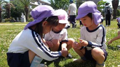 一緒にシロツメグサやタンポポを摘んだり、芝生の上を転がったりと春の自然にふれながら、遊びましたよ。今度は、もも組さんと一緒に白鷺公園に行こうね!!