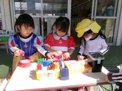 今日は気温があがってきたので、戸外でたくさん遊べました。ドレスを着たプリンセスたちは必要な小物作りに励んでいましたよ!