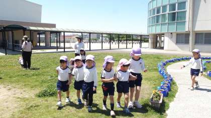 今日はとてもいい天気!もも組さんと一緒にまたまた白鷺小学校へ散歩に行きました。