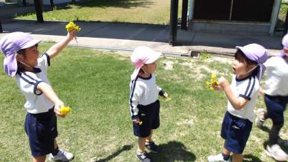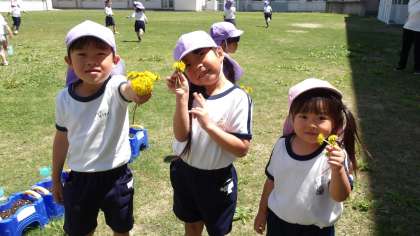 小学校の中庭には、タンポポがたくさん!!いっぱい集めている子どもたちもいましたよ。もも組さんと手をつないで、誇らしげの子どもたちでした。