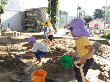 園庭では砂場で裸足になって遊びました。土を掘って水の流れをつくっていたり、船でごっこ遊びを友達と楽しんでいたりしていました。