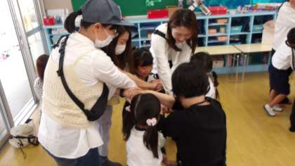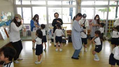 おうちの人が、幼稚園の様子を見に来てくださって、子どもたちはとても嬉しそうでした。まず最初は、お休み調べの様子を見てもらったり、みんなの大好きな歌を聞いてもらったりしました。その後は、おうちの人と一緒にダンスをしたり、ふれあい遊びをしたりしました。