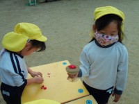 今日はペットボトルをつなげて遊んでいました。ペットボトルの蓋を流すと、水と一緒に流れます。「もっとつなげてみよう」とつなげる子や、大きいペットボトルに小さいペットボトルを隠していて、パッと小さいボトルを出す手品を楽しんでいる子などなど・・ペットボトルに触れながら色んな遊びを発見していました。ある子はマヨネーズの入れ物に水を入れて遊んでいましたよ。容器を試しながら水に触れて遊ぶ子ども達です。