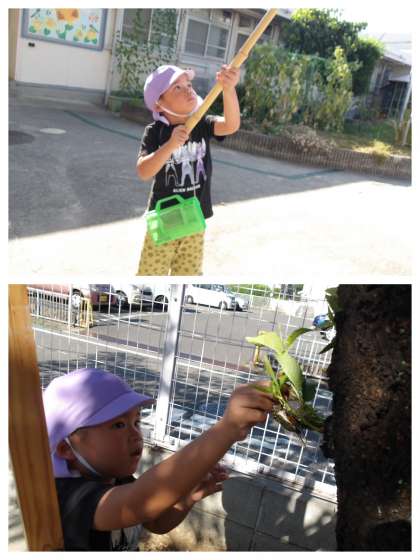 セミ取りが好きな子が、今日も夕方虫取り網をもっていざセミ取りへ!あっという間にセミを見つけて、取り方もプロ級です☆お家の人のお迎えまでのわずかな時間で捕まえたセミたちを、帰るときにはそっと木に放してあげていました。また遊ぼうね!