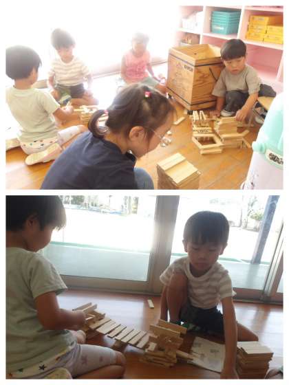 お弁当の後、カプラを使って遊んでいました。以前カプラで『橋』をつくっていた年長さんが再び橋づくりに挑戦していました。前回は残念ながら途中で壊れてしまったのですが、橋げたを先に2個作ること、間隔をどのくらいあけるかなど調節すること、そしてそ〜っとカプラを積み上げたり並べたりして、最後に台にしていたカプラを外すとなんとカプラは崩れずに大成功!見事に橋になりました。