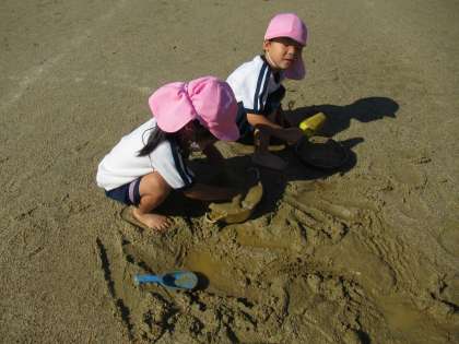 雨上がりの園庭で泥遊びを楽しんでいました。