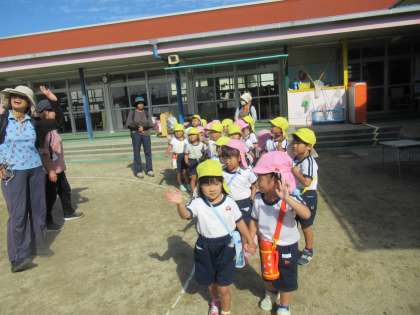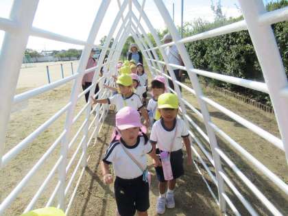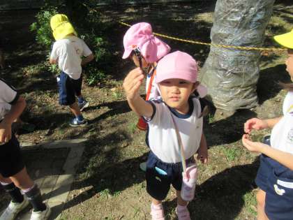 10日 今日の様子1 もも組 公開日 2024/10/10 更新日 2024/10/10 3歳児 今日は白鷺公園へ散歩に行きました。 4歳児のお兄ちゃんお姉ちゃんに手をつないでもらって、一緒に行きました。 途中ドングリが落ちていてドングリ拾いもしました。