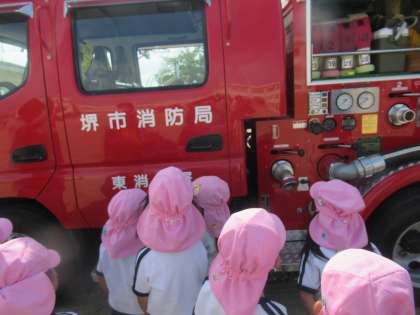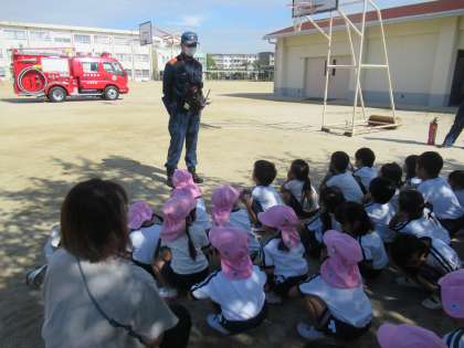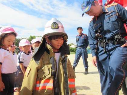 15日 今日の様子1 もも組(3歳児) 公開日 2024/10/15 更新日 2024/10/15 3歳児 今日は避難訓練がありました。 消防士さんが立ち会ってくださり、「上手に避難ができていましたね」と褒めてくださいました。 子ども用の消防服も着せてもらって嬉しそうな子どもたちでした。