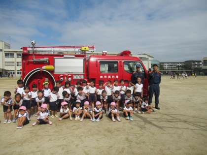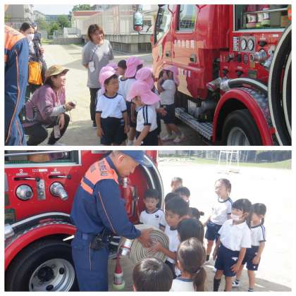 避難訓練の後は消防設備の説明を聞きながら消防車を見学したり、消防服を着させてもらったりしました。車が好きな子どもたちもたくさんいるのでみんなとても嬉しそうでした!