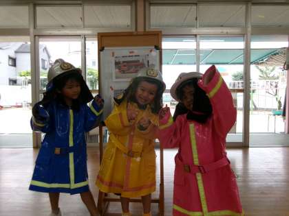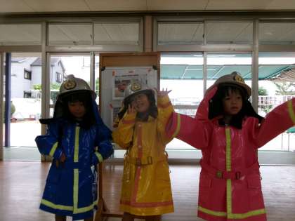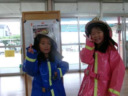 今日は消防署の服を貸してくださって、みんなでこども消防士に変身しました。