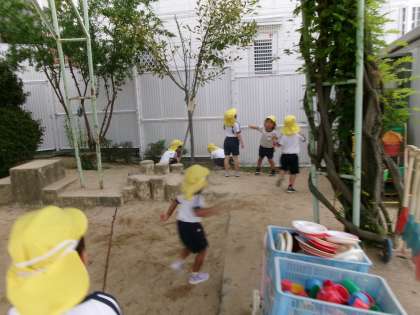 昼食を食べている時に、ふと園庭を猫が通り過ぎました。「あっ!猫や!」「あの黒猫、わんぱくだんの猫みたいやった」と追いかけたい気持ちになった子ども達。