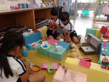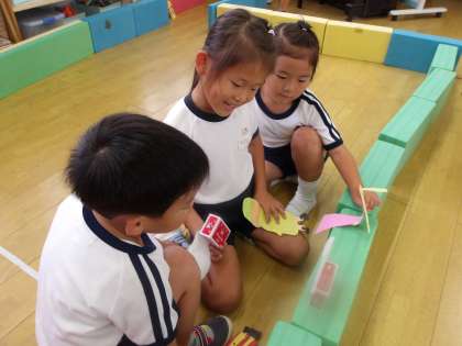 子どもたちは、1学期から継続してつくっている遊びの場で、今日も遊ぶことを楽しんでいます。遊ぶ中で必要なものが出てきたら、自分たちでつくって、遊びに取り入れていこうとする子どもたち。友達がつくっていると、友達につくり方を教えてもらって・・・。一緒に遊んでにっこり笑顔。そんなかかわりを見ていると、ほっこりしますね。