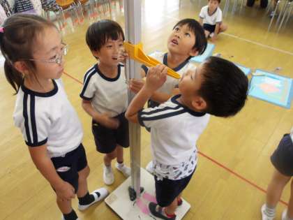 発育測定のたびに、「大きくなってるかなあ?」と測ってもらうことを楽しみにしている子どもたち。今日は、発育測定の日ではありませんが、保育室に身長計を持っていくと、子どもたちは興味津々です。「ここに数字が書いてるで」「これ動かして測ってくれるんやんなあ」などと、口々に話していました。