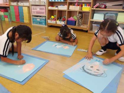 丁寧に根気よく描く子どもたち。測ってもらう時の「大きくなってるかな?」と楽しみにしている様子がのびのびと描かれていましたよ。