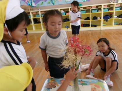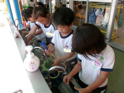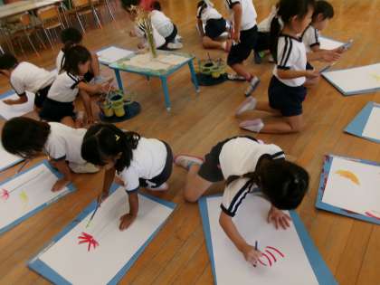 「きれいなあ」「「花火みたい」と感じた事を言う子ども達。絵の具できれいに描いて思い出にのこしましょうね。描き終わったら自分達で絵の具カップや筆をきれいに洗いました。