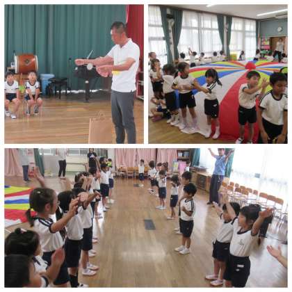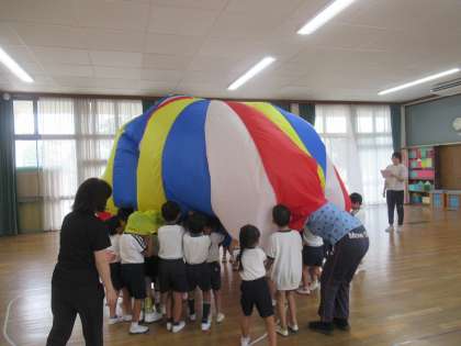 最後のお楽しみは「バルーン」です。校区運動会で3,4歳さんが披露するバルーンを年長さんも一緒にやってみました♪