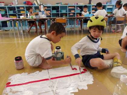 友達とどんなものをつくるのか考えを出し合いながら、つくろうとしています。言葉だけでなく、絵にかいて伝えようとする姿も・・・。つくってみることで、「もっとこうしたいな」という思いが出てきたり、「どうやってつくったらいいかなあ?」と相談したりしていますよ。