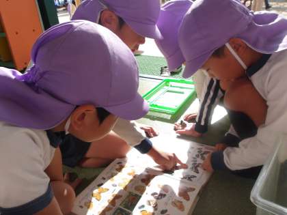 たくさんのうんちの掃除をしたり、まださなぎになっていない青虫たちのエサを取りに行ったりと大忙し!保育参観に来ていたおうちの人たちにも見せて、かわいがっていましたよ。お世話をして、みんなチョウになる日が楽しみだね!