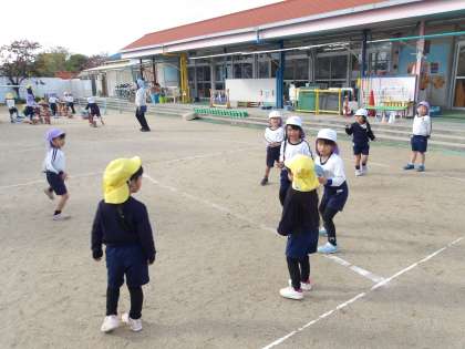 すみれ組の子どもたちが楽しそうに遊んでいる姿を見て、たんぽぽ組の子どもたちが、「いれて〜!」とやってきました。「いいよ〜!」とうれしそうなすみれ組の子どもたち。たんぽぽ組さんも加わって遊び始めると、「あっちからボールが来るよ、逃げよう」と声をかけたり、優しく投げてみたり、「当たっちゃったら、あっちに行くんやで」「こっちこっち、当たったらこっちにおいで〜」とルールを教えてあげたりしていました。すみれ組の子どもたちのやさしさが、いっぱい現れたひと時でしたよ。