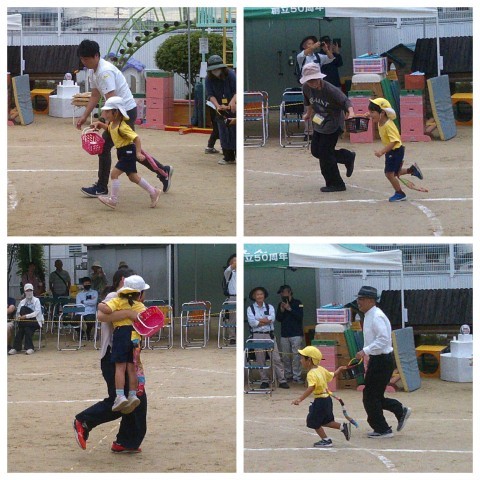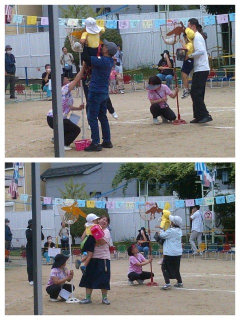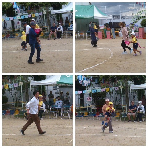 おうちの人と気持ちを一つにして、棒を持って元気いっぱい走る姿は、まるで本物の台風のように強い風が吹くほど速かったですね。おうちの人もすみれ組さんも真剣な表情でしたよ。チームの友達やおうちの人と力を合わせる姿が、さすがすみれ組さんでしたね。