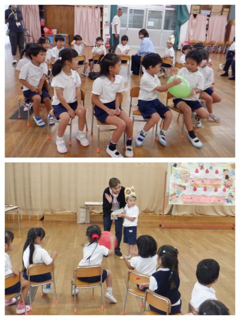今日は10月生まれのお友達の誕生会をしました。お祝いの歌を歌ったり、風船を使ってゲームをしたりして楽しみました。
