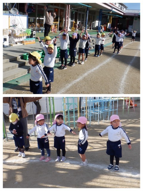 今朝はみんな9時10分のスタートに間に合いました☆頑張ったね。もも組さんは、初めてのかけ足でしたが、途中で止まったり歩いたりしないで、ゆっくりでも走り続けるというお約束を守って頑張っていましたよ。明日から気温がグッと下がるそうです。寒さに負けず、毎朝遅刻しないでかけ足頑張ろうね!