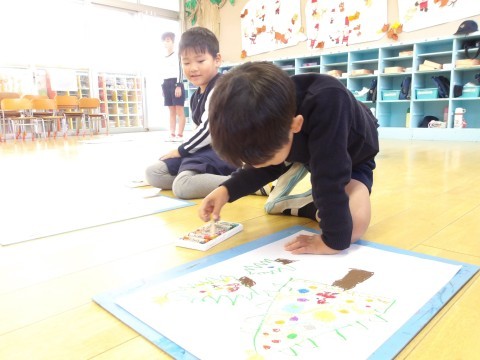 3日すみれ組 クリスマスツリーに飾りをつけたよ。