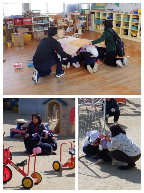 今日は、自発活動中に地震が発生したという想定で避難訓練を行いました。自発活動中なので、園庭にいたり保育室内にいたりと子どもによって活動場所は様々でした。地震はいつ起こるかわからないのでその時その場所で臨機応変な対応が必要になりますが、今日は園庭にいたのに地震が起こると保育室まで戻ってしまうなど避難の仕方にとまどう子ども達もいました。また事前指導などを通して、災害時の避難方法を伝えていきたいと思います。