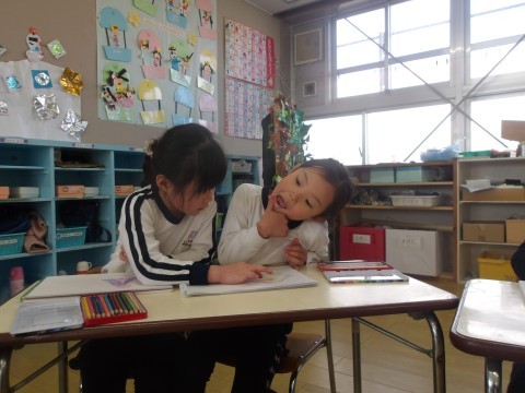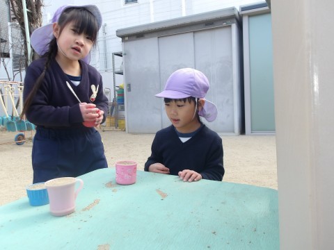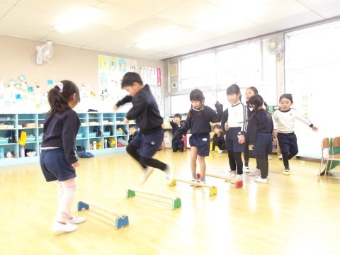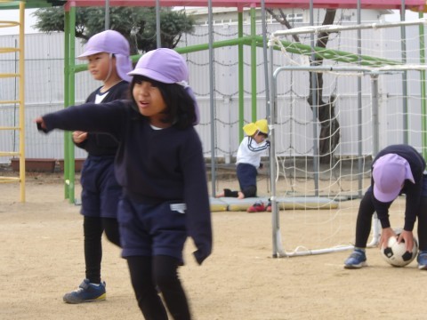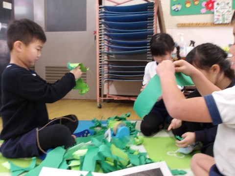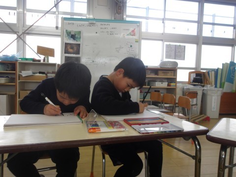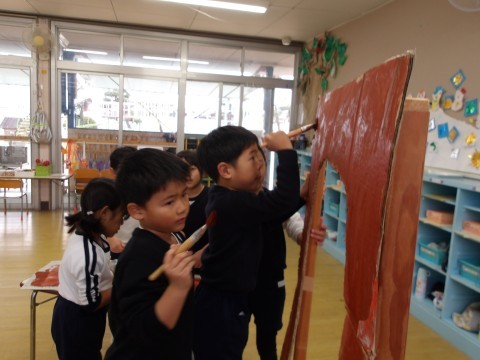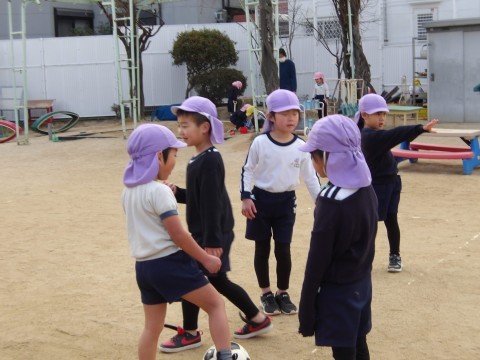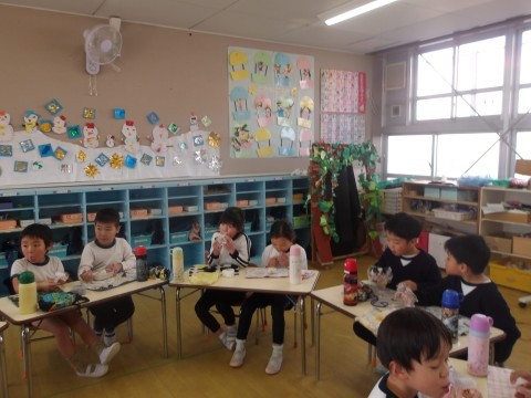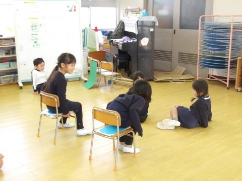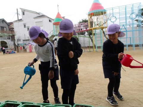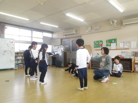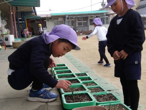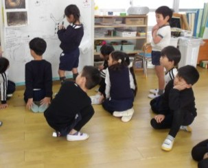 スイセンの芽が大きくなってきました。じっくり見ては喜んでいました。毎日の水やりも楽しいようです。自発の時間は,ボールをけってサッカーを楽しんでいました。劇遊びでは,洞窟の道はどんなかな~と考えたり,お化けと出会ったらどうする?など考えました。明日は続きを考えようね。