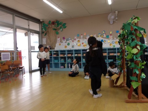 遊戯室で劇遊びをしました。今日は見てもらう人を意識して,大きく動くことや,おしりを見せないことを意識してとりくみました。