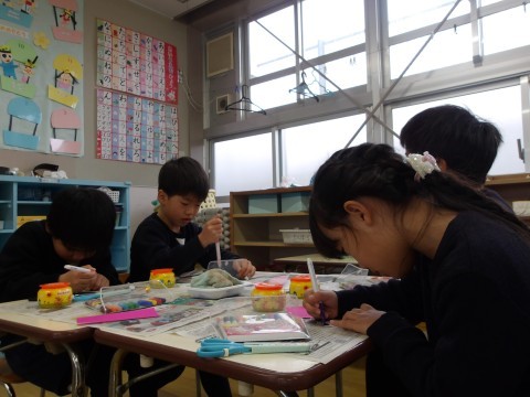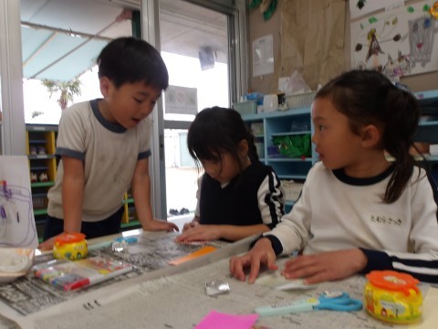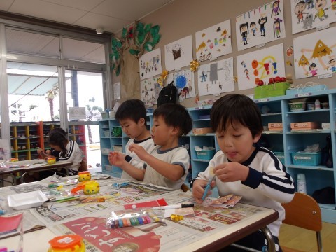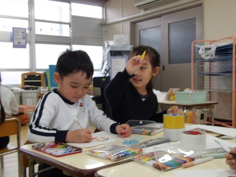 今日は久ぶりにこま回しをしたいという声がありこま回しをしました。的を作って,「ここは30てんのことな」など相談ながらこま回しを楽しんでいました。保育してでは,劇遊びの絵をかいたり,今までたくさん描いた絵を入れる作品袋に絵を描いたりしました。作品袋は幼稚園での思い出で好きなことを描いていいよというと,「リレーしているところを描きたい。」「パン屋さんをしているところを描きたい。」「劇遊びをしているところ描きたい」など思い出に残っている楽しいことをたくさん教えてくれました。