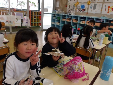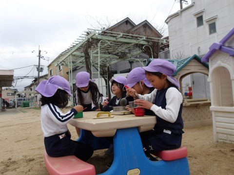 保育室では今日もお別れ会に向けて素敵な歌声を届けようと歌の練習をしたり,制作をしたりしました。お弁当までの少しの時間があるのをみつけると「あと少しみんなで遊ぼうや!」との声があり,10分ぐらいでしたが,外でみんなで増え鬼をして遊びました。めいっぱい走って楽しそうでした。
