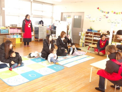 ひよこ組(0歳~入園前)は9時15分からです。寒い日が続きますので、暖かい服装で遊びに来てくださいね。また、乾燥していますので各自で水分補給をお願いします。