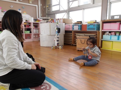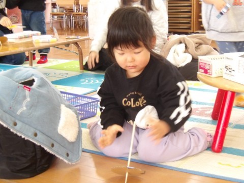 こりす組の前に,もも組の保育室で,どんぐり転がしゲームをさせてもらいました。