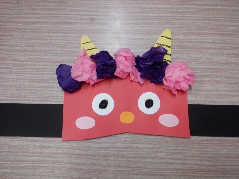 こりす組では鬼のお面をつくり、おうちの人に鬼になってもらって豆まきを楽しみました。