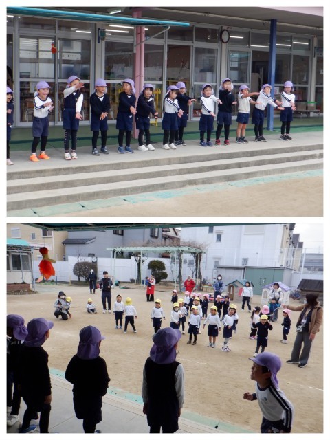 園庭で遊んだ後、今日はすみれ組さんが体操先生になって『あひるの体操』をしてくれました。さすがすみれ組さん!速いあひるもゆっくりあひるもとっても上手に見せてくれました。