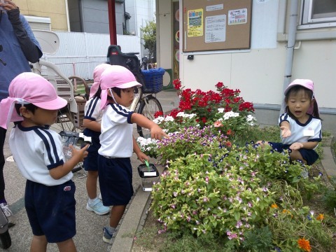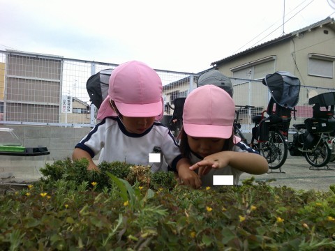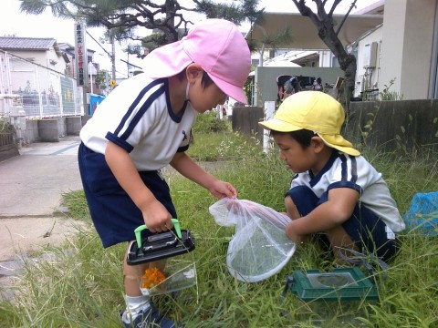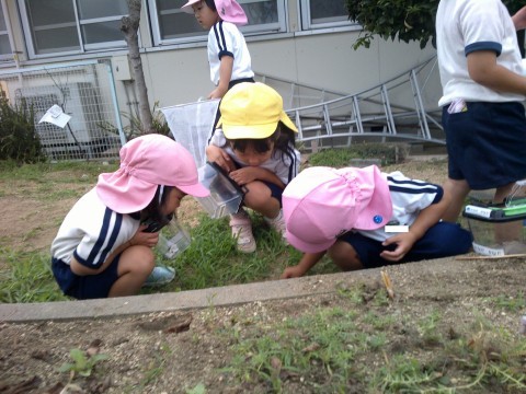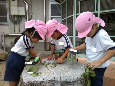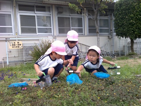 先日から、大流行の虫探し。みんな、虫を探したり捕まえることが楽しくなってきたので、1つずつ飼育ケースを渡しました。みんな自分の飼育ケースがあって大喜び!!ダンゴムシ、バッタ、トンボ、チョウ、チョウの幼虫など、いろいろな生き物を見つけて飼育ケースに入れてうれしそうにながめていましたよ。「ここにいる!」「どこどこ?」「ほんまや!」などと、近くの友達と自然と言葉を交わす姿も見られましたよ。片付けの時間になると、「おうちの人に見せたい!」と子どもたち。おうちの人に誇らしげに見せていましたね。見てもらった後は、おうちの人と一緒に花壇に返してあげる姿も見られました。また明日も元気な虫たちと遊べるといいね♪自然との関わりを通して、命の大切さを一緒に考えながら、やさしい心を育んでいきたいと思います。