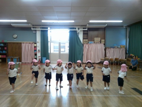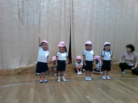 雨だったので遊戯室で元気いっぱい身体を動かして遊びました。かけっこの前の返事もどんどん元気いっぱいできるようになってきていますよ。
