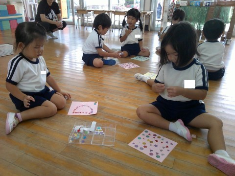 どんどん友達が、大好きになってきたもも組さん。保育室での好きな遊びの時間には、友達と関わりながら遊ぶ姿がどんどん増えてきています。時には、互いの思いがすれちがって、泣いてしまったり、怒ってしまったりする姿もありますが、それも友達と関わっているからこそ見られる姿です。いろいろな感情を表出する姿を大切にしながら、それぞれの思いに寄り添い、仲立ちしていきたいと思います。2学期になって、みんなおしゃべりする姿がう~んと増えて、クラスがどんどん賑やかになってきていますよ(*^▽^*)