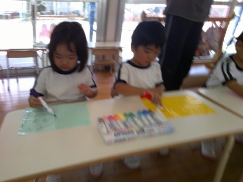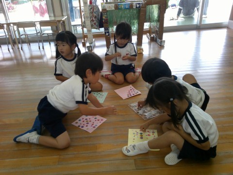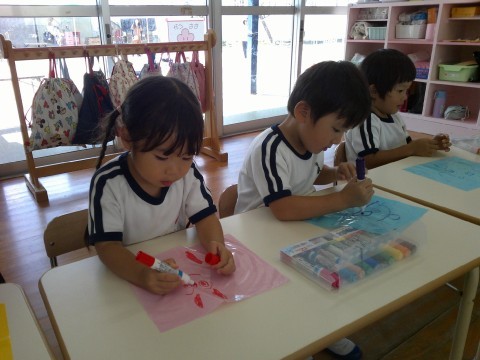 今日は、10月の生活チャレンジカードを配りました。「アカレンジャーいる」「牛乳今日飲んできた」などと、チャレンジカードに興味をもっている子どもたち。“あかレンジャー,”“きいろレンジャー”“みどりレンジャー”に色を塗って3つのグループを意識しやすいようにしましたよ。