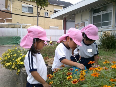 虫探しも楽しくて、継続して遊んでいます。チョウやバッタ、トンボなどを見つけると、大騒ぎ!みんな捕まえようと必死に追いかけていますよ。友達と声を掛け合って、虫かごに入れる姿も増えてきました。遊びの中で自然と友達と関わろうとする姿がとても素敵ですね♪池のメダカを見つけて、眺めている様子もあります。さまざまな生き物に興味をもち始めたもも組の子どもたち。季節も少しずつ秋の気配を感じ始めましたね。さまざまな自然にふれる機会を大切にしていきたいと思います。