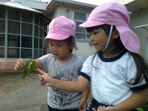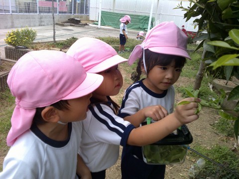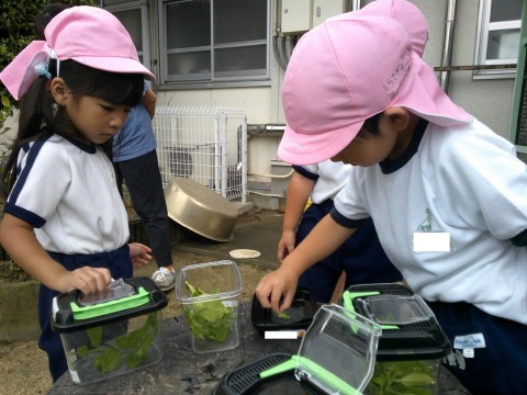 アオムシたちのお世話をする中では、これまでは触ってみたいけれど、ちょっとドキドキしていた子どもたちも、触ってみようとするようになってきました。友達が触っている姿を見ると、“私も!!”と、互いを刺激しあっている姿がほほえましいですね(*^▽^*)生き物に興味をもち、さまざまな虫との関わろうとする姿を大切にしながら、秋の自然と遊ぶ体験を楽しんでいきたいと思います。
