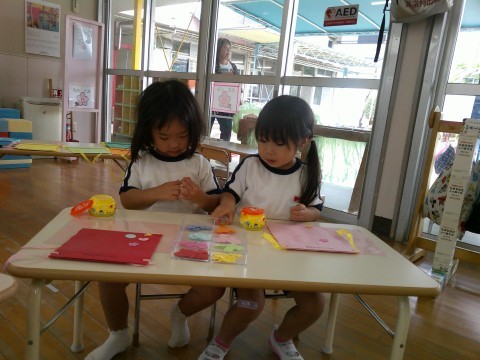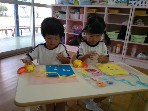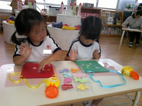 運動会でひよこ組、こりす組に渡すプレゼントが完成しました。手づくりバッグにプレゼントを入れて、未就園児担当の先生のところに「プレゼントできたよ~!」とうれしそうに渡しに行きました。先生たちの首にじょうずにかけていましたよ。運動会の日には、ひよこ組さん、こりす組さんにプレゼントしようね!