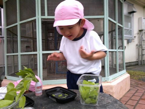 登園してくるなり、「緑になったよ!」ととてもうれしそうに飼育ケースを見せてくれた子どもたちがいます。先週見つけた黒い幼虫が、週末おうちでお世話をしていたら、緑色に変身してびっくり!!たくさんあった葉っぱがなくなって、代わりにたくさんのうんちが・・・。子どもたちは、「葉っぱいっぱい食べてた!」「葉っぱ入れないとご飯ないねん!!」とアオムシに心を寄せる様子がうかがえました。雨の止み間に早速葉っぱをとって、アオムシたちを一度外に出して、飼育ケースの中をお掃除してあげましたよ。葉っぱを入れると、ムシャムシャと葉っぱを食べる様子に見入っていましたよ。生き物の変身を楽しみにしている子どもたちです。次はどんな変身をするかな??楽しみだね♪