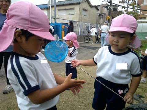 戸外では、虫探しを楽しんでいます。虫網片手にトンボを追いかけて、必死で捕まえようとしていますよ。虫網を使って、トンボを捕まえるのに大成功!!周りにいた子どもたちも、一緒に大喜びしていましたよ。虫網から、そ~っと出そうとしていると、虫かごの蓋を開けている友達がいて、ナイスプレイでした(*^▽^*)
