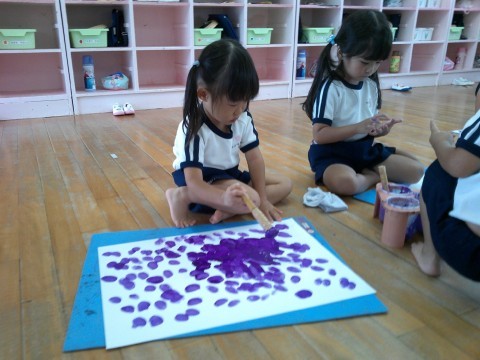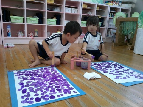 保育室では、絵の具を使って絵をかきました。おいしそうなブドウがた~くさん!思い思いにのびのびと描きました。