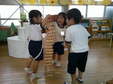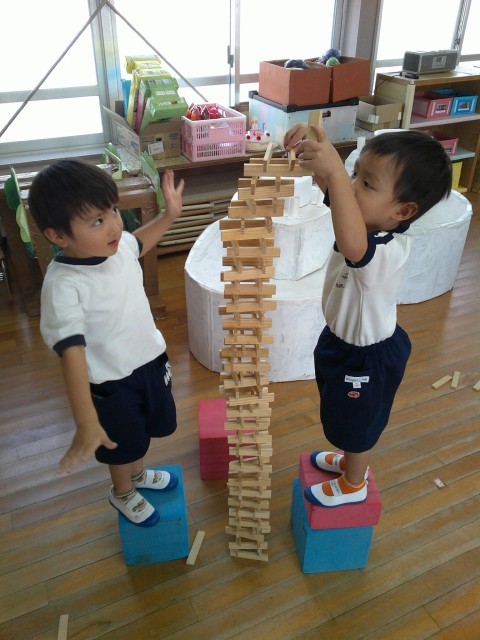 午後からの好きな遊びの中では、カプラが大人気!今日は、高く高く積み上げていく楽しさを見つけたようで、重ねては崩れてを繰り返していました。自分たちの背よりも大きくなってくると、「乗せれないよ~!」とつぶやいた後、ウレタン積み木を取りに行き、上に登って続きを楽しむ姿がありました。「こうやったらできる!」と課題解決を自分でしようとする姿や友達の姿を見てまねようとする姿が見られ、自分たちで工夫しようとしてびっくりしました。遊びの中でいろいろなことを感じ、考えて遊びを広げていこうとする姿、とても素敵ですね(*^-^*)