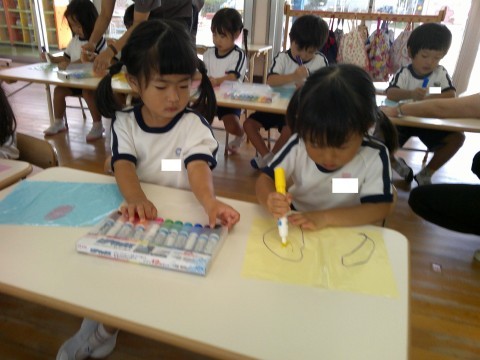 園庭の万国旗に驚いていたもも組さん。もうすぐ、運動会だからみんなも旗をつくろうと投げかけると、とてもうれしそうでしたよ。“楽しく遊んでいるところを描こう”と伝えると、動物ごっこやかけっこをしているところを描いていましたよ。みんな、自分なりのイメージをのびのびと描いていました。運動会当日は、子どもたちの描いた旗が、運動会をより一層盛り上げてくれることでしょう(*^▽^*)ぜひ、探してみてくださいね♪