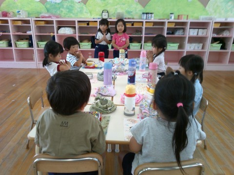 2学期になってから、お弁当の時の当番活動も始めました。なかよしルームで過ごしたことのある子どもたちは、すみれ組さんが“いただきます”をする時の当番をしてくれるのに憧れているようで、夏休み中は一緒に当番をさせてもらう姿もありました。そこで、もも組でもやってみると、張り切って当番活動をしてくれます(*^▽^*)“見て、憧れて、まねてみようとする”姿は、とても素敵ですね♪お休み調べの当番活動も、毎日張り切っています。周りの子どもたちも、当番の友達に協力しようとする姿が見られます。もも組の一員として参加しようとする姿が見られてうれしく思います。